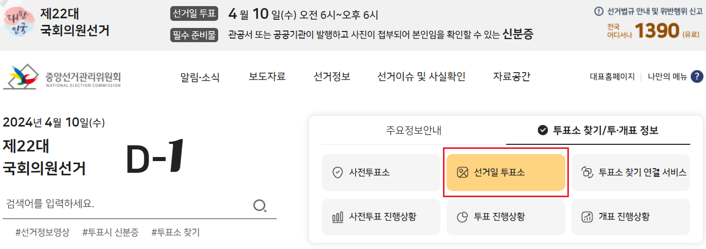 2024년 4월 10일은 제22대 국회의원 선거일입니다. 선거일 투표는 정해진 투표소에서 투표해야 합니다. 내 투표소가 어디인지 몰라 찾고 계셨다면 선거일 투표소 찾는 방법과 선거일 투표소에서 주의해야 할 사항을 빠르게 확인하실 수 있습니다.