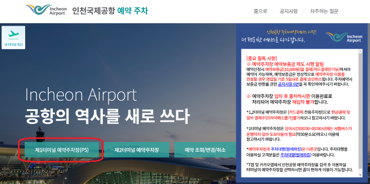 링크를 통해 인천공항 예약주차 홈페이지로 이동하여 제1터미널 예약주차장(P5)을 클릭합니다.