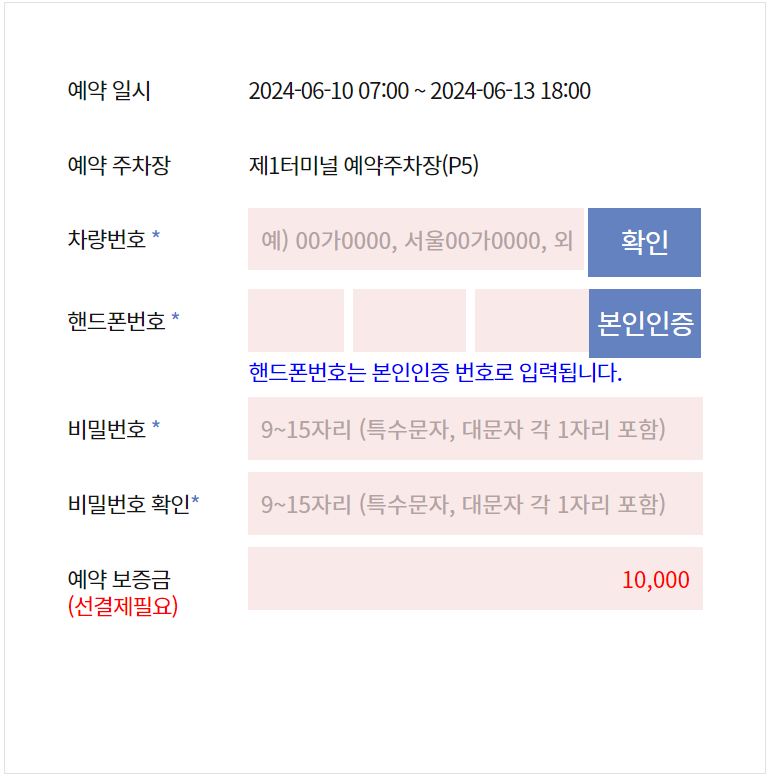 차량번호를 입력하고, 핸드폰 번호를 입력하야 본인 인증을 하고, 예약을 진행합니다. 예약 보증금 제도가 생겨서 예약보증금 10,000원 선 결제함으로 예약이 완료됩니다. 출차 시 주차요금 정산 후 선 결제한 보증금은 영업일기준 5일 이내 전액 반환처리 됩니다.